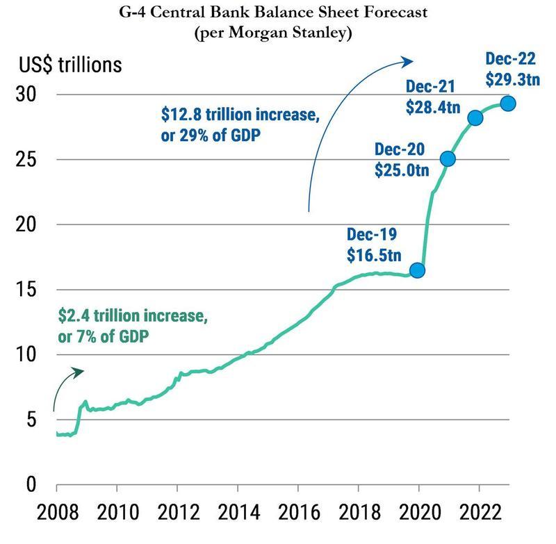 下图显示的是摩根斯丹利对G4央行资产负债表的预测,认为其未来将大幅扩张