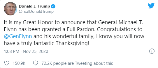 特朗普称,“迈克尔·弗林已获得完全赦免。祝贺他和他的家庭,我知道你们现在将会有一个真正美妙的感恩节!”