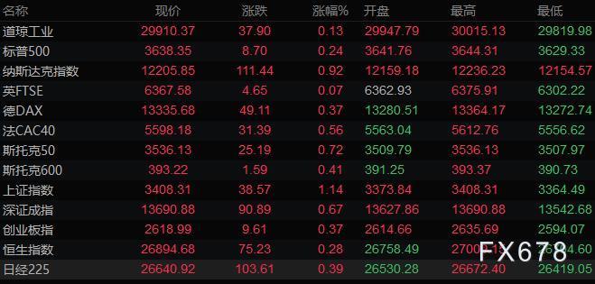 美股三大指数集体收涨,道琼斯指数收涨37.90点,涨幅0.13%,报29910.37点;标普500指数收涨8.70点,涨幅0.24%,报3638.35点;纳斯达克指数收涨111.44点,涨幅0.92%,报12205.85点。