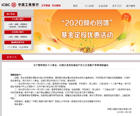 中国工商银行(601398,股吧):近期,受全球疫情及国际政治经济形势影响,国际国内贵金属价格持续出现较大幅度波动,市场风险和不确定性显著增强。为保护投资者权益,自北京时间2020年11月28日24:00起,暂停公司各渠道(包括柜面、手机银行、网上银行、工银e投资)个人账户黄金、账户白银业务新客户开立交易账户,已开户客户的正常交易不受影响。