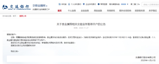 交通银行:近期,受国际政治经济形势及新冠疫情等影响,贵金属市场价格波动剧烈,投资交易风险加大。为做好投资者权益保护,自北京时间2020年11月28日12:00起,暂停我行记账式贵金属、个人贵金属代理延期交易和满金宝业务新客户开立账户。