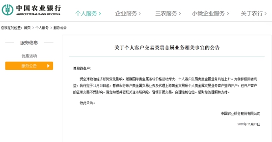 中国银行:我行将于2020年11月28日起暂停代理个人上海黄金交易所业务、双向账户贵金属产品的签约服务,已签约客户的正常交易不受影响。提示您及时关注市场变化带来的相关风险,合理控制仓位,理性投资。