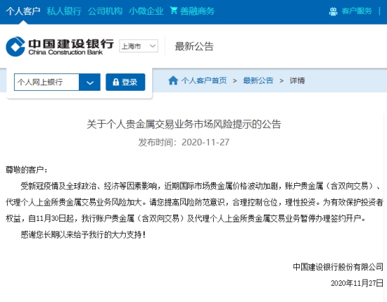 中国建设银行(601939,股吧):受新冠疫情及全球政治、经济等因素影响,近期国际市场贵金属价格波动加剧,账户贵金属(含双向交易)、代理个人上金所贵金属交易业务风险加大。请您提高风险防范意识,合理控制仓位,理性投资。为有效保护投资者权益,自11月30日起,我行账户贵金属(含双向交易)及代理个人上金所贵金属交易业务暂停办理签约开户。