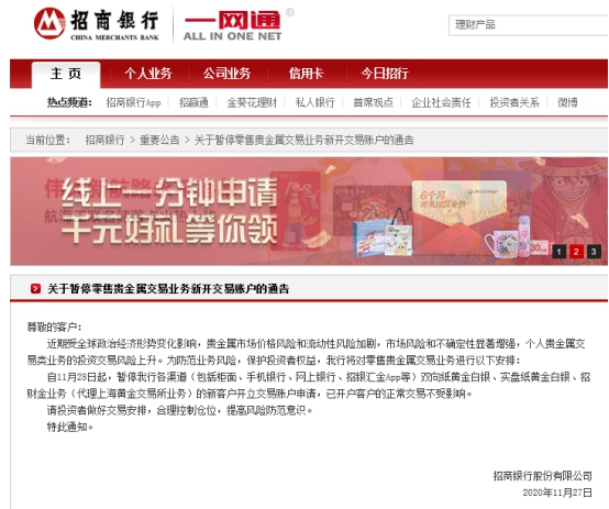 中国市场“罕见”消息:周五11月27日,中国工行、农行、中行、建行、交行、招行六大银行都发布重要公告,自28日起暂停账户贵金属交易等业务客户签约开户,已开户客户的正常交易不受影响。