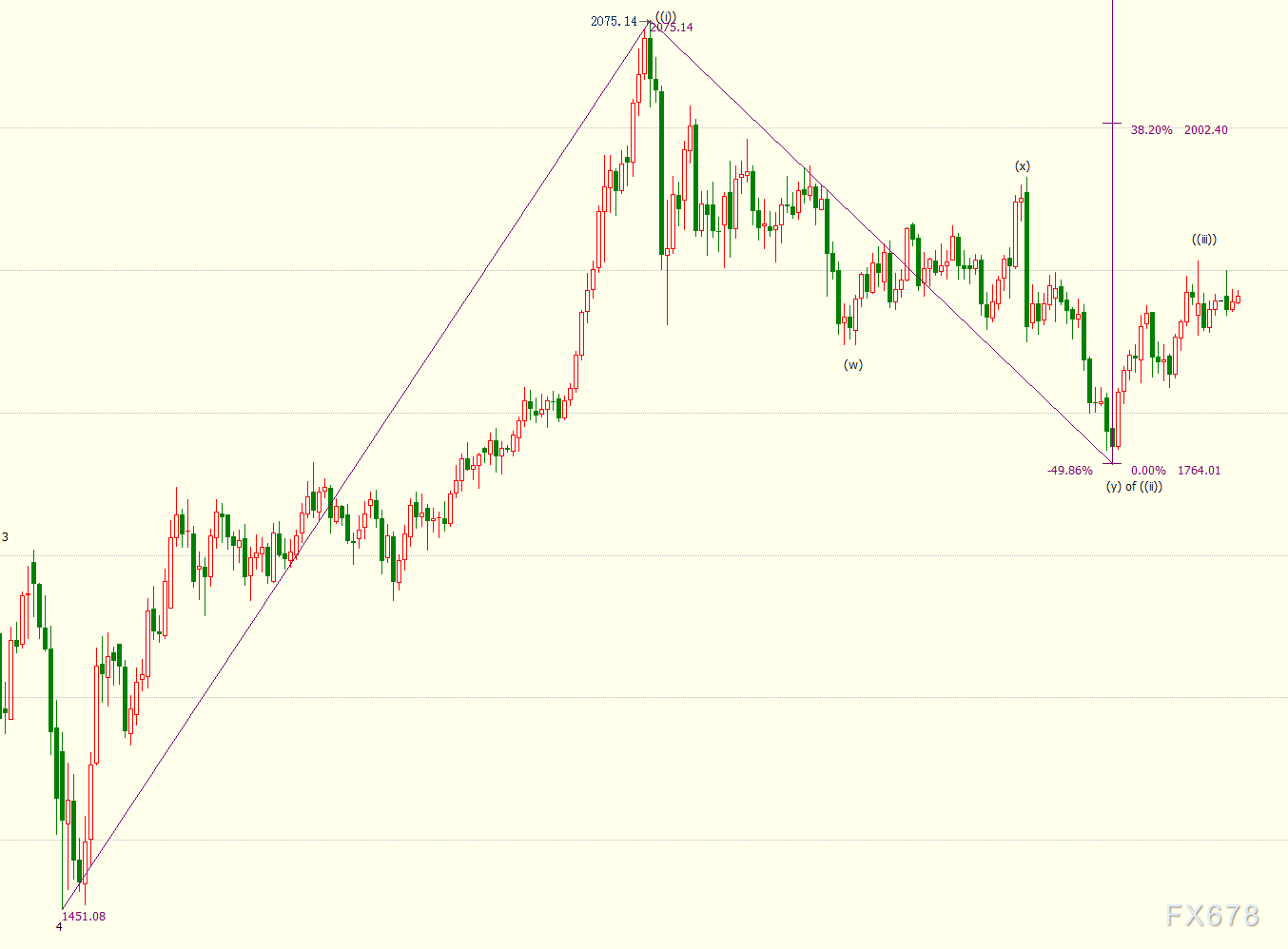 日线图上看,金价自1764美元开启上行((iii))浪走势,((1))浪是((iii))浪的三级子浪。((iii))浪的23.6%和38.2%目标位分别在1911美元和2002美元,((iii))浪是自1451美元开启的上行5浪的子浪。
