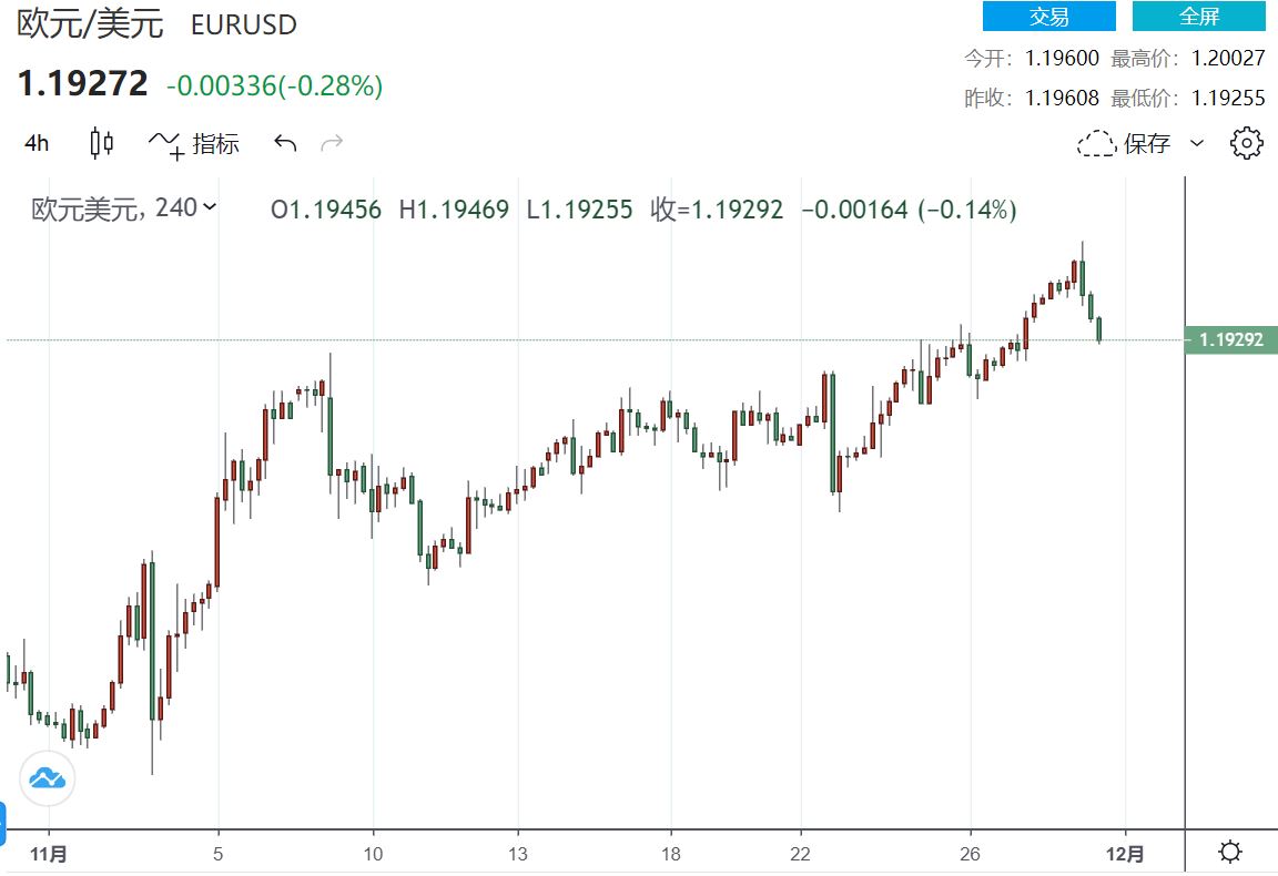 元大期货(北美)讯 周一(11月30日),欧元/美元目前在1.1935附近交易,日内低点是1.1930,高点是1.2003,在纽约交易的时段里,欧元/美元的交易价格下跌了0.2%。欧洲央行(ecb)今年早些时候曾表示,它正在密切关注欧元/美元汇率。但欧元11月份上涨2.6%,创下7月份以来的最佳月度表现。