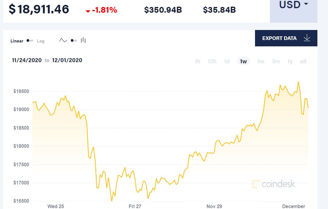 元大期货(北美)讯 周二(12月1日),比特币在前一天突破历史高点后未能延续涨势,在尝试突破2万美元的重要关口中失败,今天下跌1%至19000美元附近。