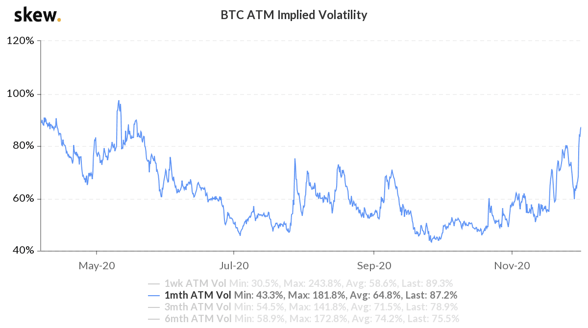 (比特币的隐含波动率升至数月高点,来源:Skew)