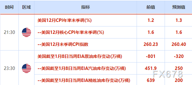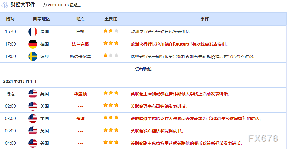 周三(1月13日)亚洲时段,美元指数窄幅震荡,徘徊在90关口附近。周二(1月12日)美元指数大幅走弱,受到美债收益率冲高回落的拖累,因两位美联储官员都认为现在就讨论缩减购债还为时过早。金价则在守住200日均线1840附近支撑后小幅上涨至1855附近;美原油周二继续冲高,美油一度创10个月新高至53.45美元/桶,一方面市场憧憬拜登的进一步刺激计划,另一方面,API原油库存持续大幅下降,共同推高油价。周三市场将重点关注美国12月的CPI数据和美联储主席鲍威尔在内的多位美联储官员讲话。