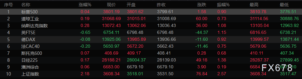 美国三大股指微涨,道琼斯工业指数上升60点,或0.19%,至31068.69点。标普500指数上涨1.58点,或0.04%,至3801.19点。纳斯达克指数上升36.00点或0.28%,至13072.43点。