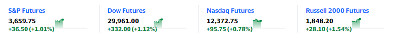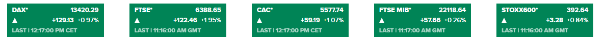 欧美股市:欧洲股市今天高开高走,截至发稿,德国DAX30指数、英国富时100指数、法国CAC40指数、意大利富时MIB指数、欧洲斯托克600指数分别上涨1.0%、2.0%、1.1%、0.3%和0.9%;美国股指期货悉数拉升,四大指数期货走势如下图: