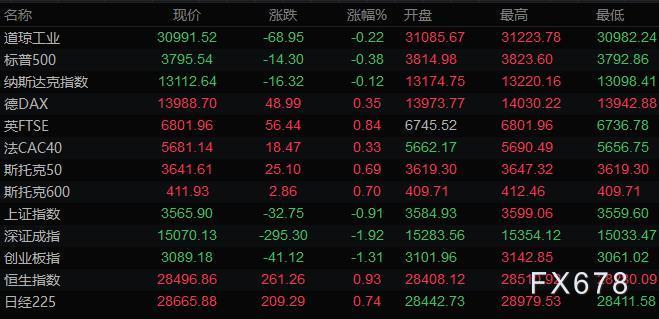 美股三大指数全部收跌,道琼斯指数收盘下跌69.00点,跌幅0.22%,报30991.52点;标普500指数收盘下跌14.30点,跌幅0.38%,报3795.54点;纳斯达克指数收盘下跌16.30点,跌幅0.12%,报13112.64点。