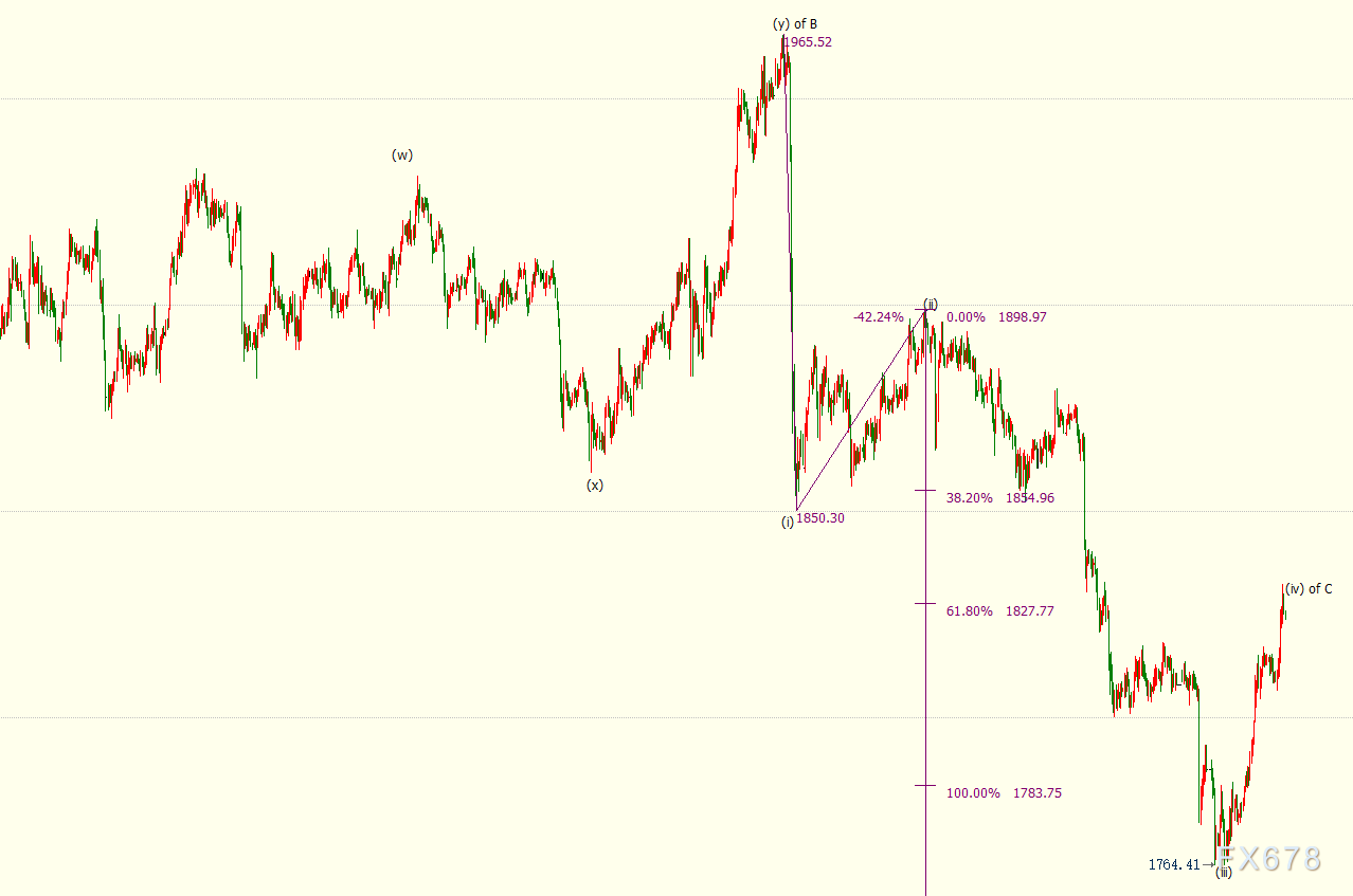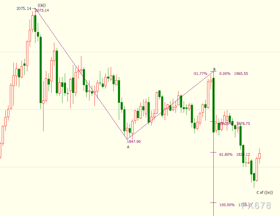 小时图上看,金价处于自1764美元开启的(iv)浪,但在升破(iii)浪61.8%目标位1828美元后料重新走弱,启动下行(v)浪走势。(iii)浪、(iv)浪和(v)浪都是C浪的子浪。