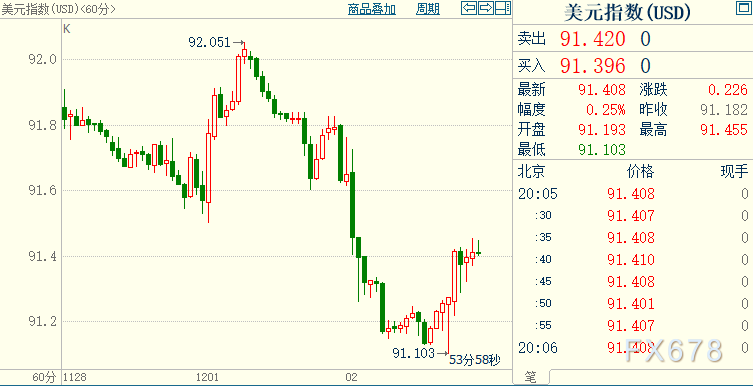 北京时间20:05,现货黄金上涨0.49%至1823.14美元/盎司;COMEX期金主力合约上浮0.38%至1825.8美元/盎司;美元指数上涨0.27%至91.41。美指日内一度下跌0.07%至9月1日以来新低至91.103。