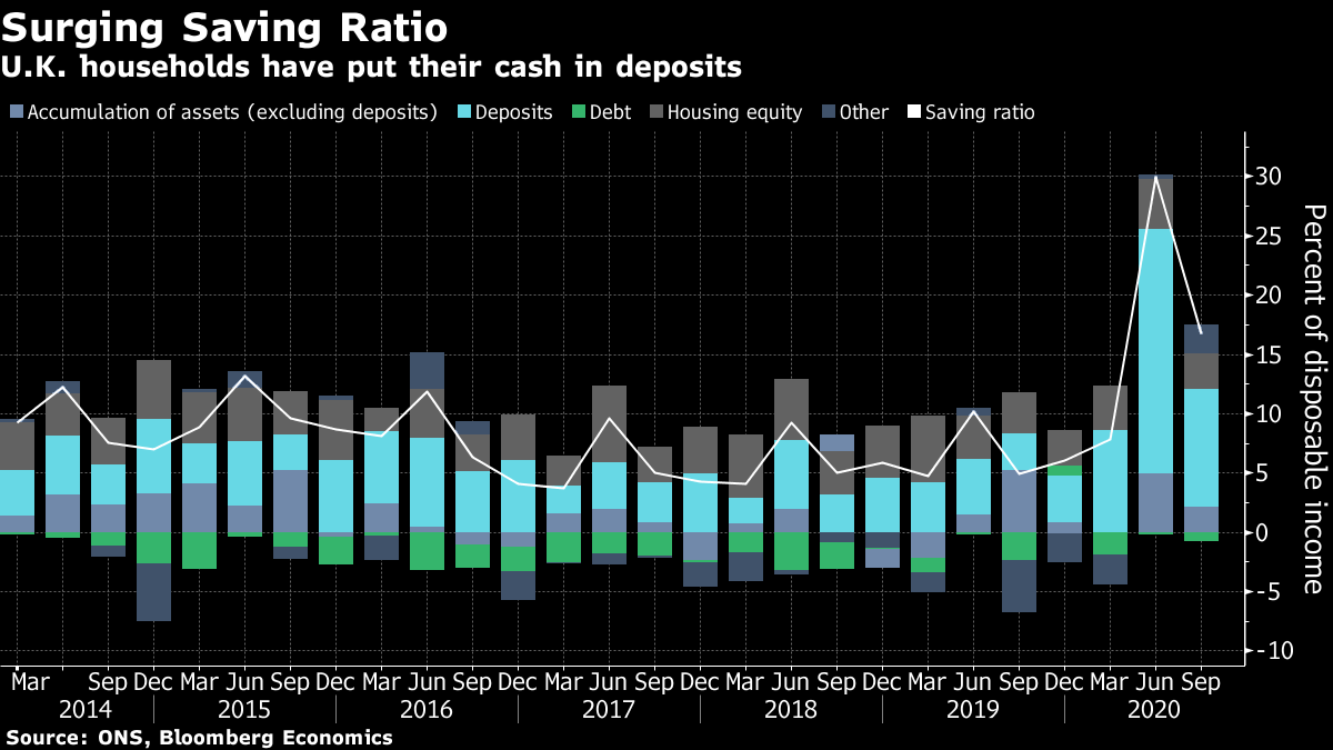 此外,由于封锁限制了消费的机会,加上英国政府史无前例的收入保护计划,使得英国居民储蓄率在2020年第二季度飙升至历史最高水平,且已经连续三季度保持在高位。