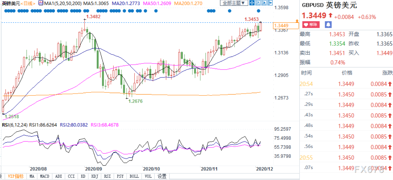 周四(12月3日)欧市盘中,英镑兑美元加速上涨触及9月1日新高1.3453,虽然此前欧盟外交官称在渔业方面仍存在重大分歧,但他至少透露了会谈仍在推进中,并继续试图攻克此前遗留下的难题,而这仍然推动了市场乐观情绪复燃,此外新冠病毒疫苗方面的积极消息和美国财政刺激计划带来的乐观情绪持续对酵,美元跌至逾两年半低点也提振英镑。