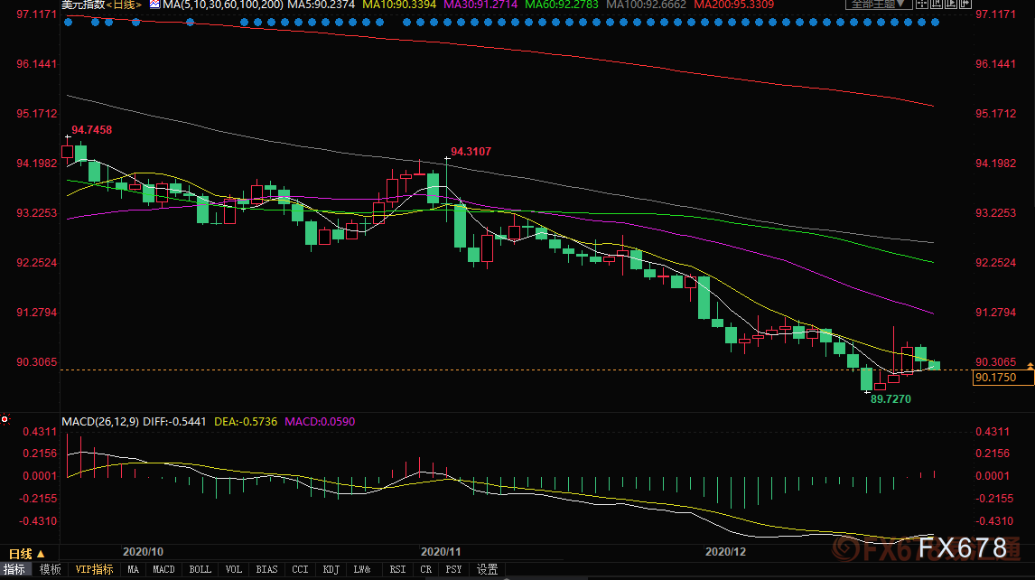 2020年年初时,美元的跌势受到避险需求的支撑,美元指数一度涨至103附近,但自三月以来一直在下滑,近期更是一度跌破90大关,创逾两年半新低。2021年,预计随着全球经济复苏,美元将面临更大的下行压力。在大规模印钞、通胀、经济复苏、风险偏好情绪和宽松的货币政策影响下,分析师预期美元贬值或将持续数年。