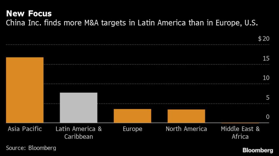 中资企业寻求海外收购的这一年充满挑战,不过拉美一跃而出,成为一些企业可以成功联姻的地区。根据彭博汇编数据,中资企业海外并购势将连续第四年下降,今年规模仅有311亿美元,为2007年以来最低水平。而针对拉美的交易规模为77亿美元,比欧美加起来还要多。