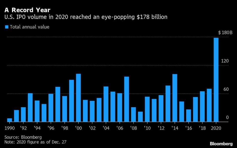 今年是IPO年。彭博汇编的数据显示,2020年共有将近500家公司在美国上市,合计筹资1,782亿美元,创出了历史最高纪录。其中大约230宗IPO交易来自特殊目的收购公司(SPAC),合计筹资规模占到了总规模的44%。这些SPAC以空壳形式上市,筹资是为日后搜寻收购目标所需。知名品牌技术公司上市下半年也呈现出卷土重来之势,爱彼迎和Doordash Inc.挂牌首日皆有出色表现。