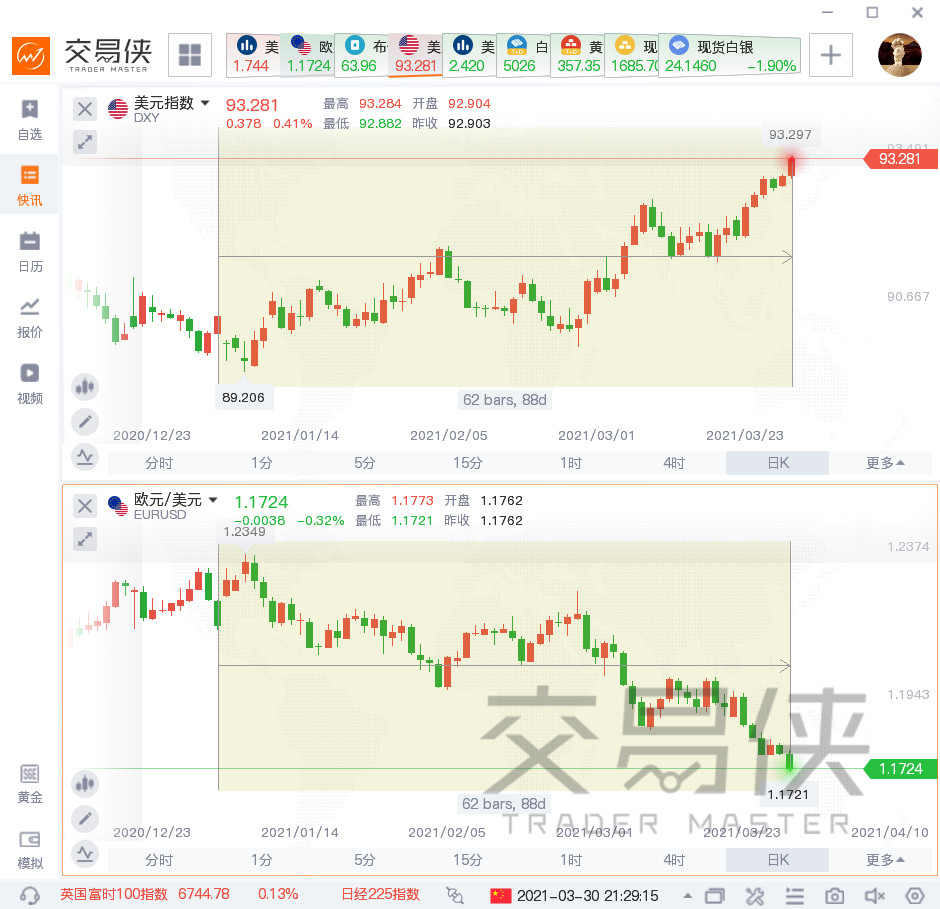 然而,随着第一季度接近尾声,美元兑非美货币汇率升高,欧元兑美元周二跌至1.1734%,为去年11月11日以来首次。美元指数周二升破93点,创四个多月以来的新高。美指在2020年下跌6.7%后,今年迄今为止已反弹了3.2%。