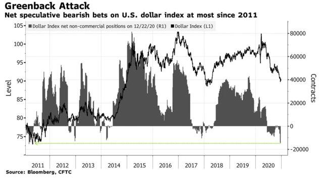 在美银本月中旬发布的基金经理月度调查中,做空美元曾是仅次于做多科技股的第二大拥挤。而如今,这一态势似乎正愈演愈烈。据彭博社报道,年末将至之际,投机性资金正进一步大力押跌美元。