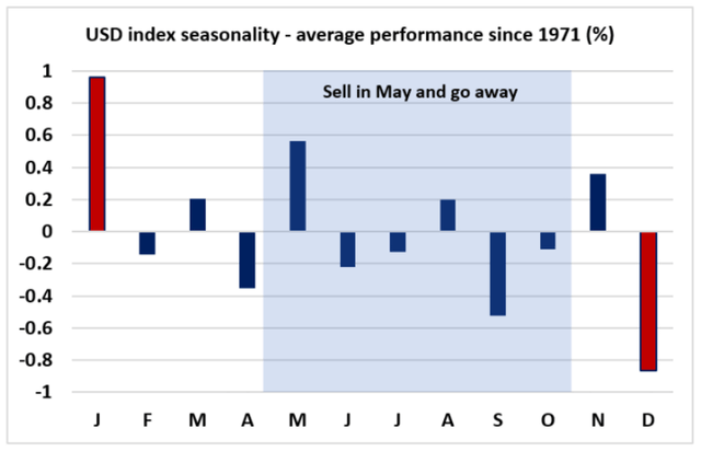 当然,需要提醒投资者尤其是美元空头的是,在过去50年的季节性波动看,12月对美元来说是一个疲软的月份,平均回报为-0.85%,但1月往往是美元表现最好的月份,自1971年以来,1月份美元指数平均回报接近1%。