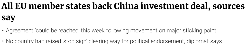 据《南华早报》获悉,中国和欧盟本周可能达成一项具有里程碑意义的投资协议,尽管此前有所保留,但欧盟27个成员国将一致批准该协议。