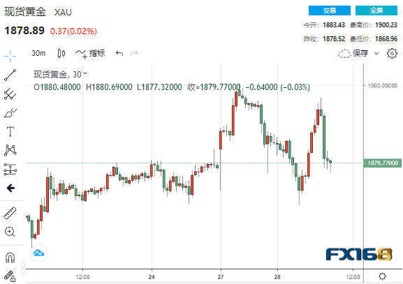 现货金走势震荡,亚市盘中一度触及去年12月21日以来的最高水平1900.04美元/盎司,随后震荡下跌至1868.96美元/盎司,美市早盘自低点大幅反弹至1890美元/盎司关口上方,但随后再次自高位跳水,现交投于平盘略上方。