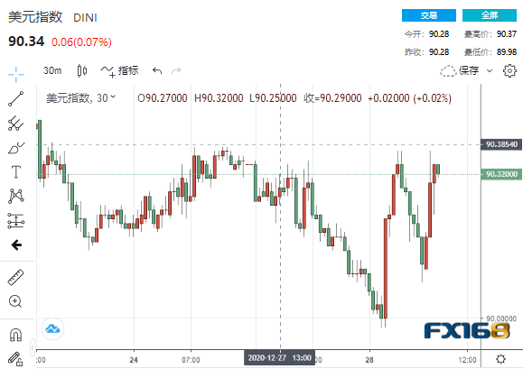 元大期货(北美)讯 周一(12月28日),金融市场交投震荡,美元指数和现货黄金走势跌宕起伏,其中美元指数在跌破90关口之后转而上涨,现货黄金一度突破1900美元/盎司关口,但随后自高位震荡回落。美国总统特朗普周末意外签署了一项9000亿美元的冠状病毒救济法案,避免了政府关门,并将失业福利扩大到数百万美国人。投资者现在密切关注美国众议院周一的投票,将对个人的新冠救济支票从600美元增加到2000美元,特朗普表示,参议院“将启动程序”批准上调支付额。中欧局势方面也传来了一则消息,据据《南华早报》报道,在酝酿了7年之后,中国和欧盟本周可能达成一项具有里程碑意义的投资协议,欧盟27个成据称将一致批准该协议。