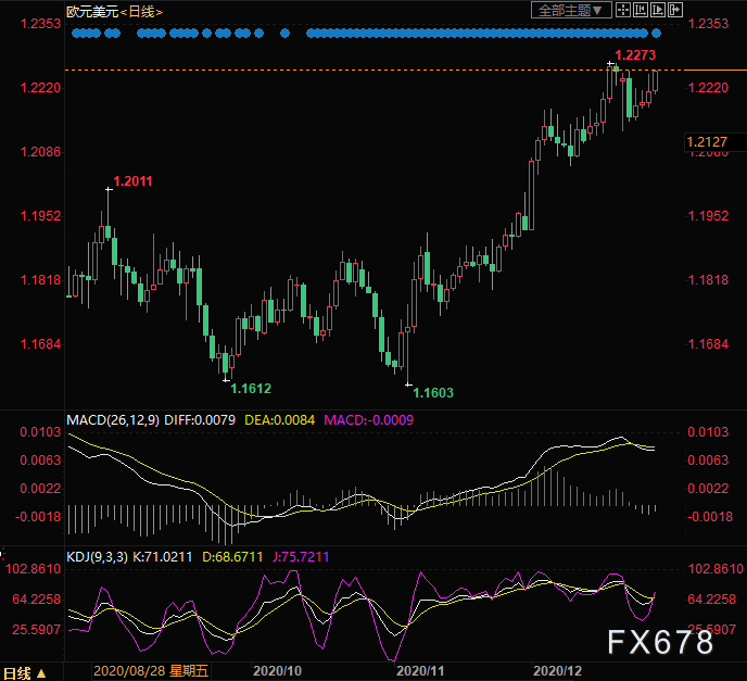 欧洲时段,欧元兑美元小幅上涨,现报1.2256,涨幅0.32%,因美元疲软以及风险情绪的升温,另外交易员正在消化欧盟与英国上周在圣诞节前夕达成贸易协议的结果,对于化解“无协议”风险松了一口气。围绕新冠病毒和美国刺激方面的消息仍可能带来一些波动性,因假期而缩短的本周交易量可能依然清淡。欧盟与中国投资协定的谈判亦提供助力。在欧元兑美元已经稳稳站上1.20关口的背景下,涨向1.25的通道也已经重新打开。