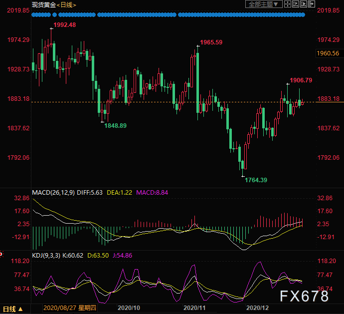 欧洲时段,现货黄金小幅上涨,现报1878.86美元/盎司,涨幅0.27%,金价周二在清淡交易中陷入震荡,尽其如此,如果在年内最后两个半交易日中不出现重大意外,那么现货黄金月K线仍然将收得强势上涨,扭转此前自8月创得历史新高以来月线四连阴的颓势。金价当前在消息面受到多空拉锯消息的争夺,这在日内的震荡走势上也表现得尤为明显,一方面,美欧疫情继续加剧的状况,令投资者担忧情绪仍然存在,同时美元指数的持续弱势也对金价利多,但另一方面,市场却仍对疫苗在此后进一步普及应用的前景期待有加,在此状况下,又叠加上年底将至交投气氛清淡,因而金价横盘宽幅震荡仍是短线趋势所在。之后市场则将关注在1月份惯常会出现的亚洲市场季节性实物需求高峰对金价的影响,这可能会拉动现货金价在2021年继续录得开门红。