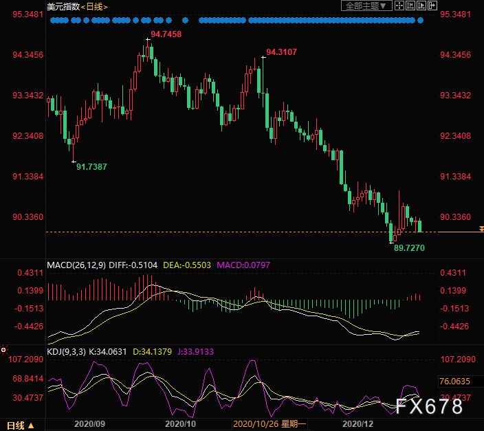 欧洲时段,美元指数走低,现报90.04,跌幅0.28%,一方面,在美国国会两院有望进一步扩大宽松规模的状况下,市场风险情绪转暖令避险美元继续遭到抛售,另一方面,投资者也因此而对美国未来财政健康状况更加感到担忧,并担心美联储来年可能出台更激进的债务融资政策从而进一步损害美元的购买力,在此背景下,美元的颓势仍难以扭转。而这也意味着如果在年内最后两个交易日内没有戏剧性扭转行情,美元指数将自2014年以来首次收于100个月均线水平之下,这将意味着长期行情趋势的转势破位。