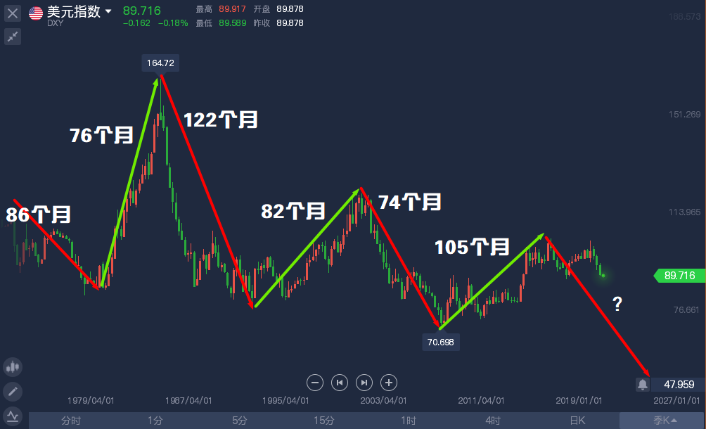 摆在我们面前的问题有很多,我们迫切想要知道;美元究竟有没有周期论一说?如果有,现在处于下跌周期吗(之后还会下跌吗)?现在是处于熊市的哪个阶段呢(还会跌多少、跌多久)?