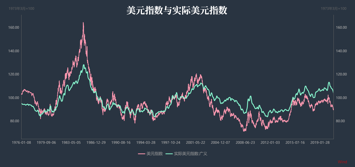 首先,研究美元周期选用的指标不同,可能会得出不同的结论。大刘这里选用是名义美元指数,也有分析师选取的是实际美元指数(名义美元指数扣除通胀因素之后),或者贸易加权美元指数。
