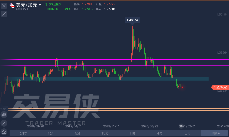 从行情走势来看,美元兑加元在突破2019年低点后就奠定了下降趋势,RSI也重回下行通道,依然存在进一步下跌的空间,下方最近的目标区间为1.25,然后将挑战2018年的低点1.2247;现价上方的1.2960-1.3064则是美加接下来的重要分水岭,这里曾是2017-2019年多空转换的重要区间,只有突破这一区间(图中的蓝色部分),才能扭转跌势。