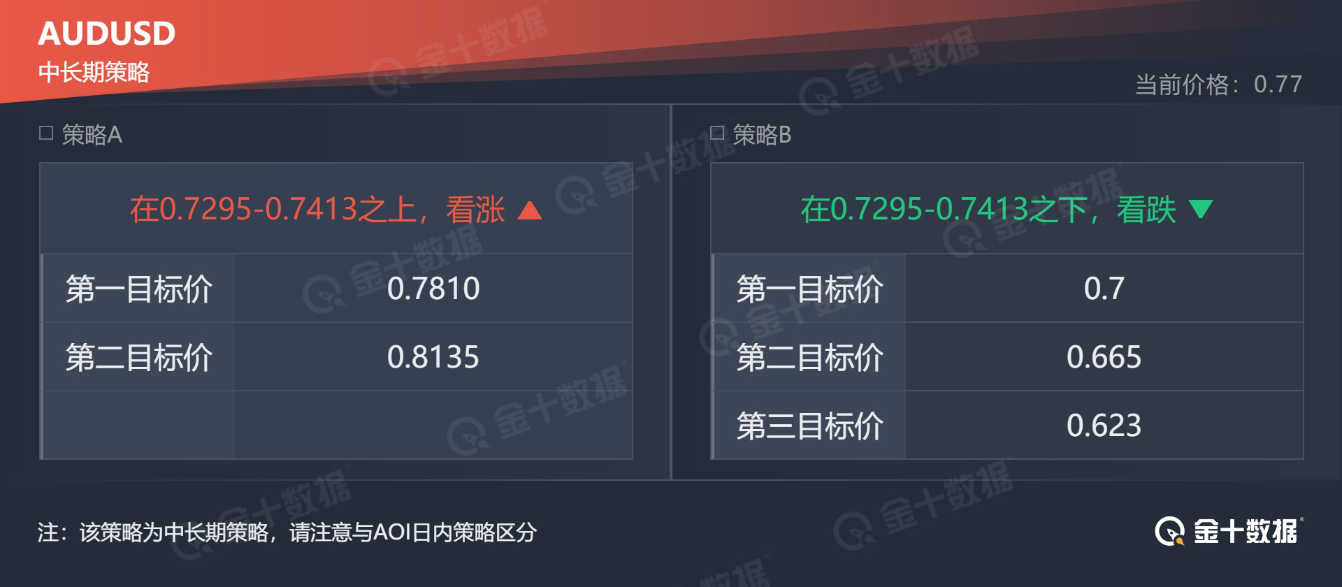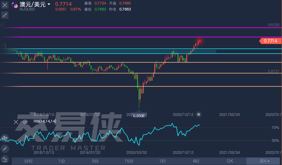 从周线图来看,澳元兑美元RSI技术指标已升至70上方,进入超买区域,可能会引发短线大幅回调。目前价格接近上方阻力0.781,下一阻力将是0.818,这也是2018年的高点。但这并不意味着上升趋势结束,只有价格回落到0.7295之下,才能进一步看跌。