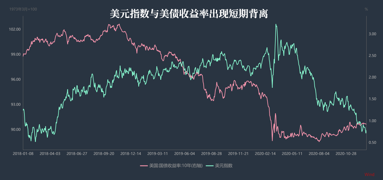 ①首先,从美元指数与十年期美债收益率对比来看,二者呈现出大级别同步、小级别背离的走势,而美债收益率已经自2020年8月的底部开始缓慢回升。