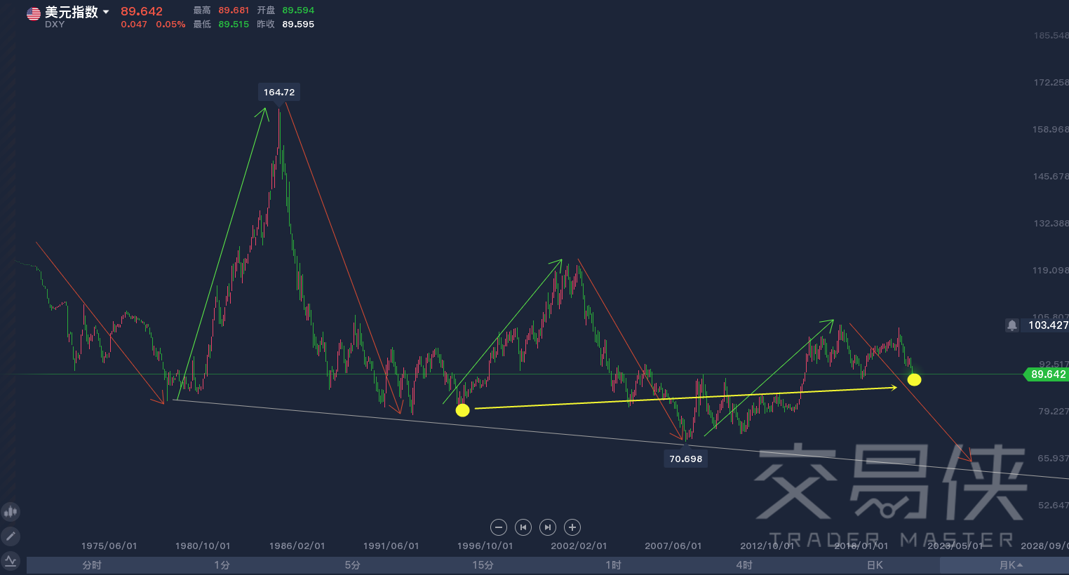 因此,不考虑任何基本面,仅从技术形态来看,美元长周期(根据历史行情是6-10年)下行的趋势是显而易见的,目前可能正处于一个熊市开始阶段。