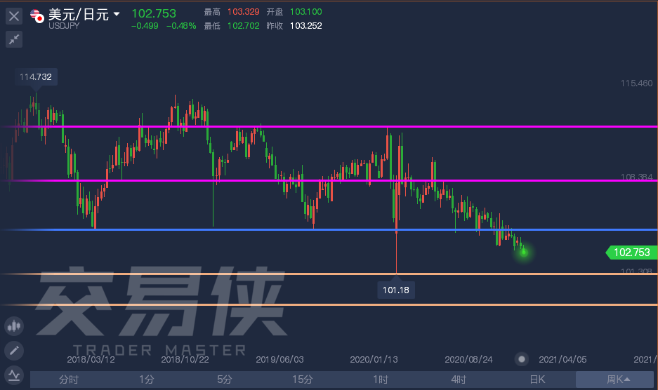 回顾整体走势,美元兑日元已经连续四年处于看跌趋势,其中2020年累计下跌约650点,除去3月的巨幅波动,目前价格已经回到2016年下半年的水平。