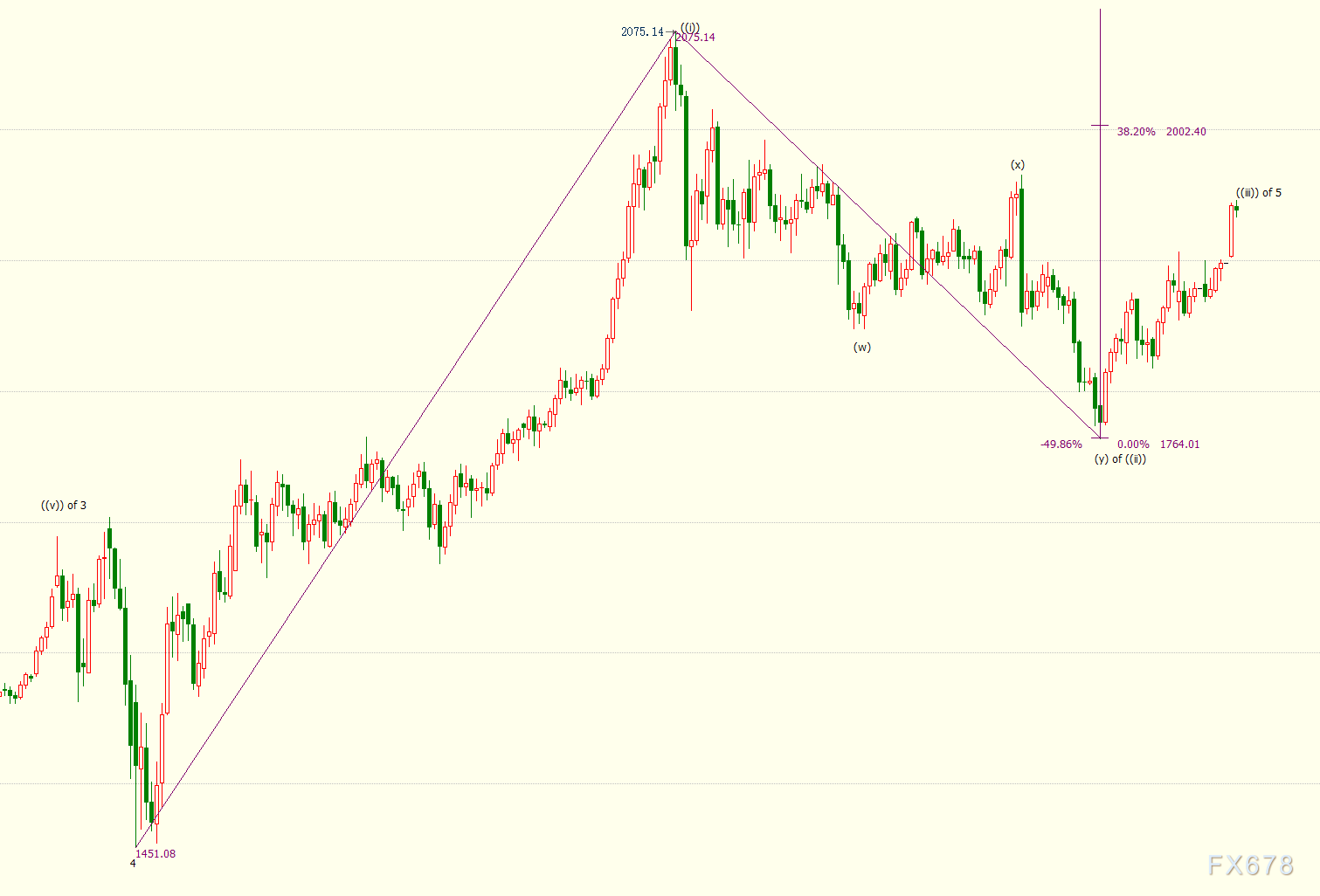 日线图上看,金价自1764美元开启上行((iii))浪走势,((i))浪是((iii))浪的三级子浪。((iii))浪的38.2%目标位在2002美元,((iii))浪是自1451美元开启的上行5浪的子浪。