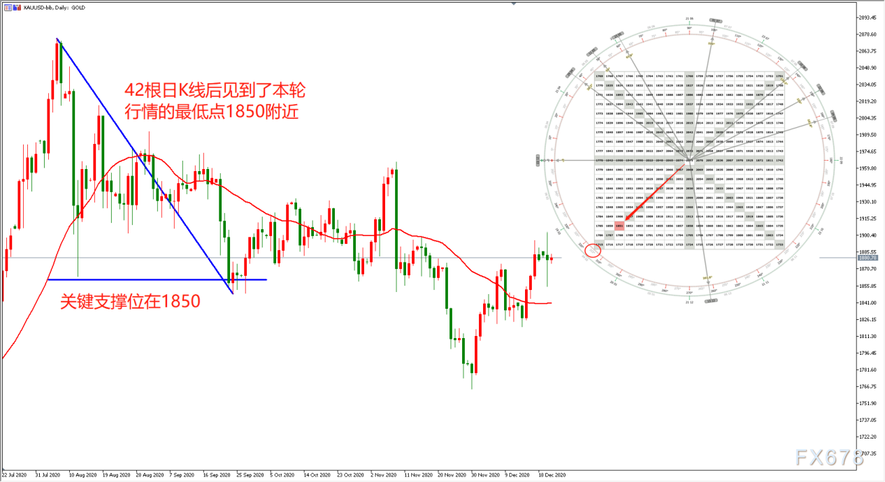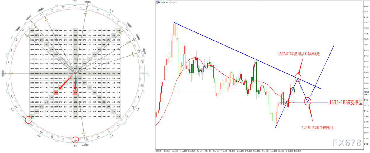 运用同样的方法,分析师演算出了2021年的黄金行情。从11月30日黄金的最低点起算。根据三维周期理论推演,11月30日(启动日)启动至今,行情将会在第21根K线出现关键转折。启动点的点位为1765点,而根据日线级别高点所作出的下跌趋势线压力位为1915附近,1909-1915恰好也是江恩之轮135°、180°的强阻力。