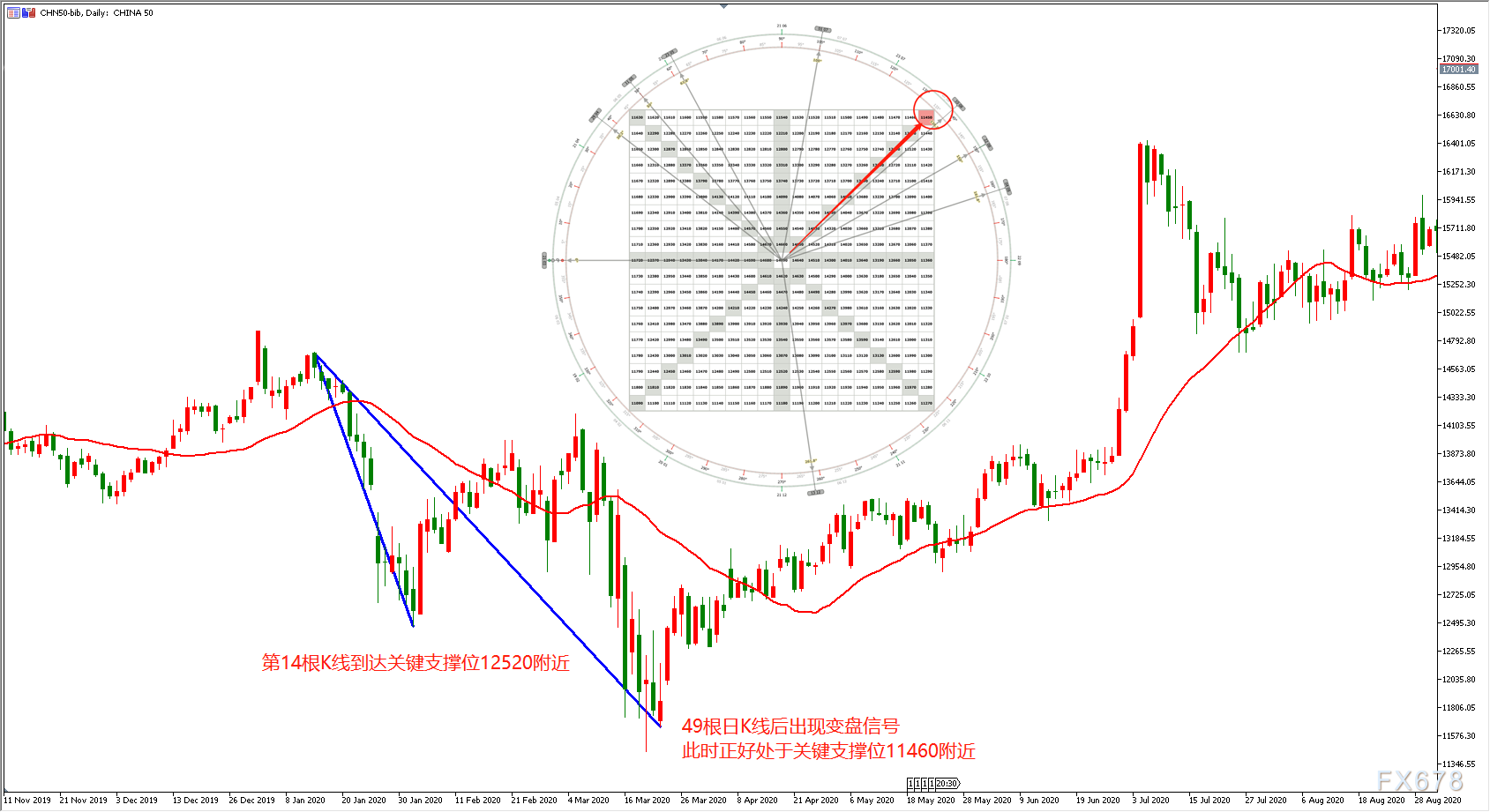 运用同样的思路,分析师再次运用江恩的时间周期理论计算出新华A50将会在第49天结束本轮下跌调整。通过前期低点支撑可以观测到,市场在11450一带有较强支撑。而通过江恩之轮可以计算出,11450正好处于135°所构成的正四方形强支撑处。因此,照样通过时间与空间的逻辑关系可以推算出,市场或将在第49天触碰到本轮下跌的最低点,并且结束下跌。