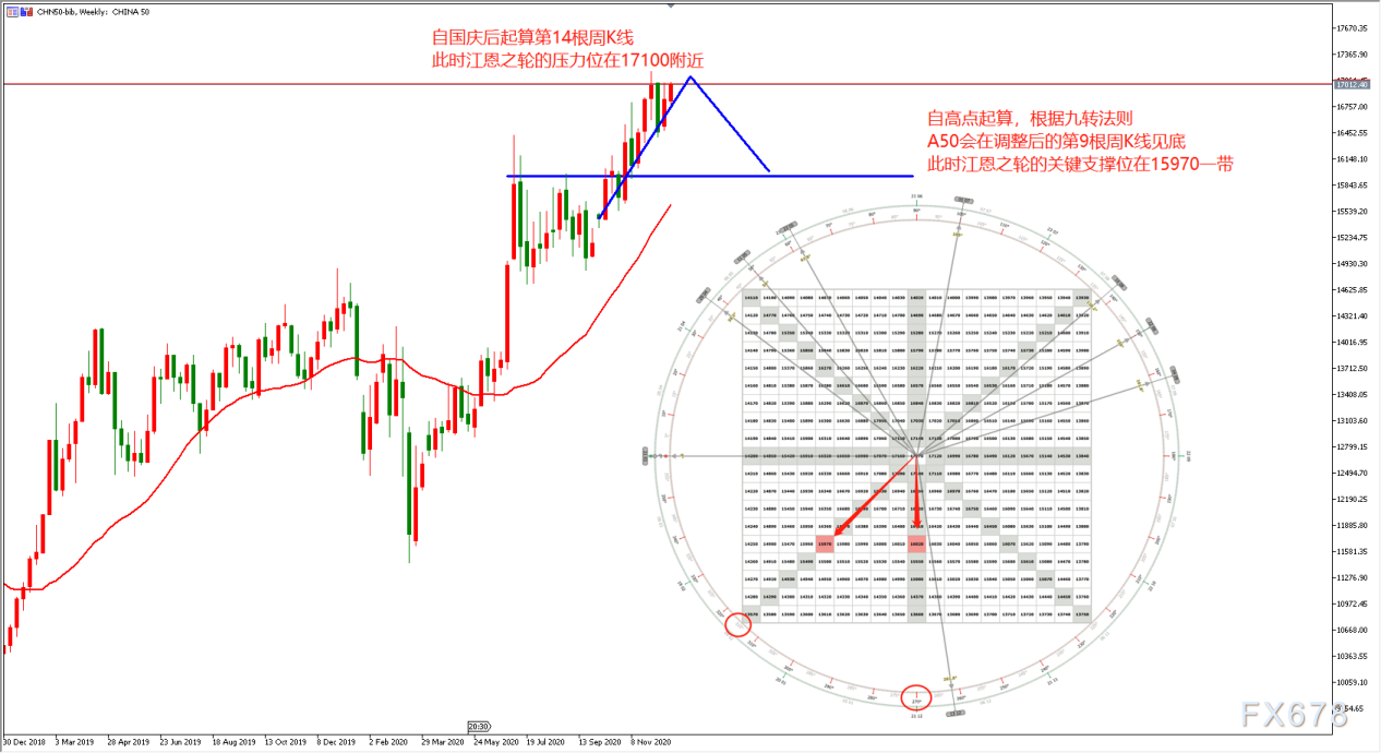 利用三维周期理论,我们还可以来预测一下未来的市场行情。以新华A50目前的周线为例,本轮行情自国庆以来的单边上行,市场已经运行了11根K线(12月21日当周)。根据时间周期理论,市场将会在第14根K线处出现转折,恰巧在第14根K线处于1月中旬,此时市场资金紧缺,年底调整概率较大。那么我们要捕捉的不是这一波调整,而是在这一轮调整之后,市场自第14根K线调整开始,往后再计算第9根重要周K线,也就是3月15日起的周K线。此时的新华50接着节后的春季攻势,且本身资金量就非常充沛,另外,结合事件时间点,此时也恰逢两会期间,热点题材爆发,市场走单边牛市概率极大。那么我们在返回去计算,市场将会在第14根K线附近触碰高点。通过江恩之轮计算,市场将会在360°(即0°)与45°夹角之间触碰到较强压力,也恰巧是2020年年内新高附近,点位是17100-17170之间。在触碰到高点后,计算3月15日结束时的调整支撑位。通过时间与空间理论分析,市场前期高点在16000点附近,而此时江恩之轮的超强支撑角度在270°与315°之间,这个夹角的支撑在15970-16020之间,符合技术形态。