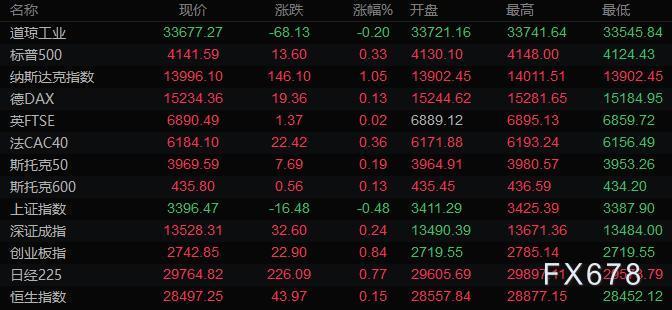 美股三大指数收盘涨跌不一,标普500指数再创历史新高。道琼斯指数收盘下跌66.35点,跌幅0.20%,报33679.05点;标普500指数收盘上涨12.14点,涨幅0.29%,报4141.17点;纳斯达克综合指数收盘上涨146.10点,涨幅1.05%,报13996.10点。