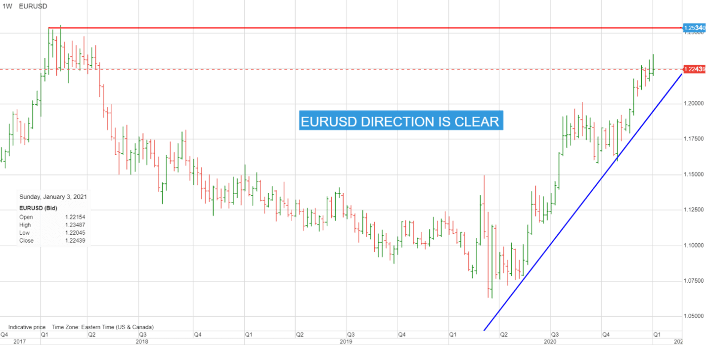 周线图清楚地显示了欧元/美元的走势及其1.2500-35的目标。
