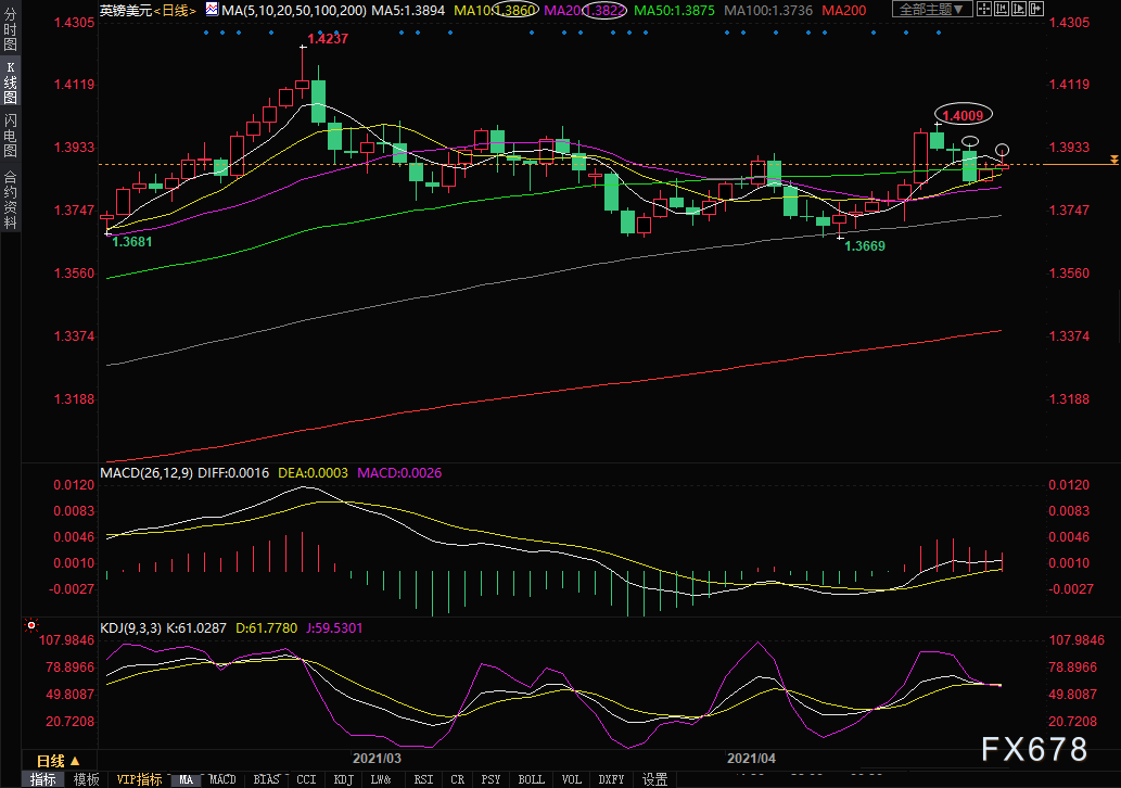 下方初步支撑位在10日均线1.3860,接下来是20日均线所在的1.3822和1.38关口。