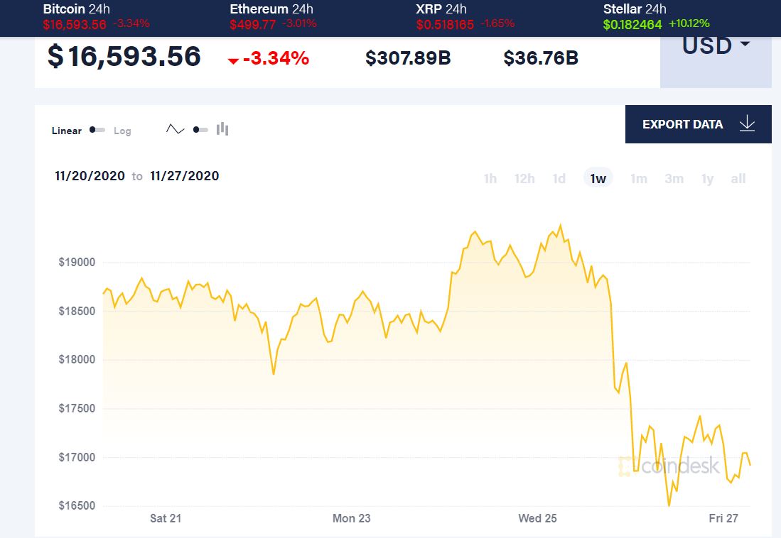 元大期货(北美)讯 周五(11月27日),比特币小幅走低,下跌3.34%,至16593美元。昨天就出现了自比特币在疫情爆发以来的最大跌幅,这种抛售引发了人们对今年加密货币热潮的新的怀疑。