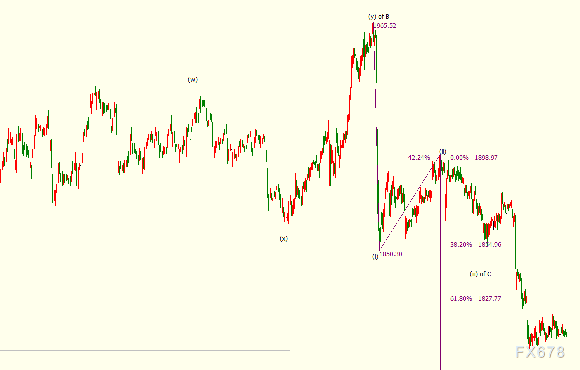 C浪是自2075美元开启的调整((iv))浪的子浪,((iv))走势继续延伸。小时图上看,C浪料呈现五子浪模式,目前金价处于自1899美元开启的(iii)子浪,100%目标位在1784美元。
