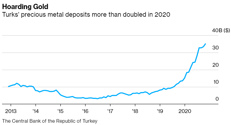 再加上里拉汇率的下跌,这种贵金属为当地投资者提供的回报远远高于债券或土耳其的基准股指。