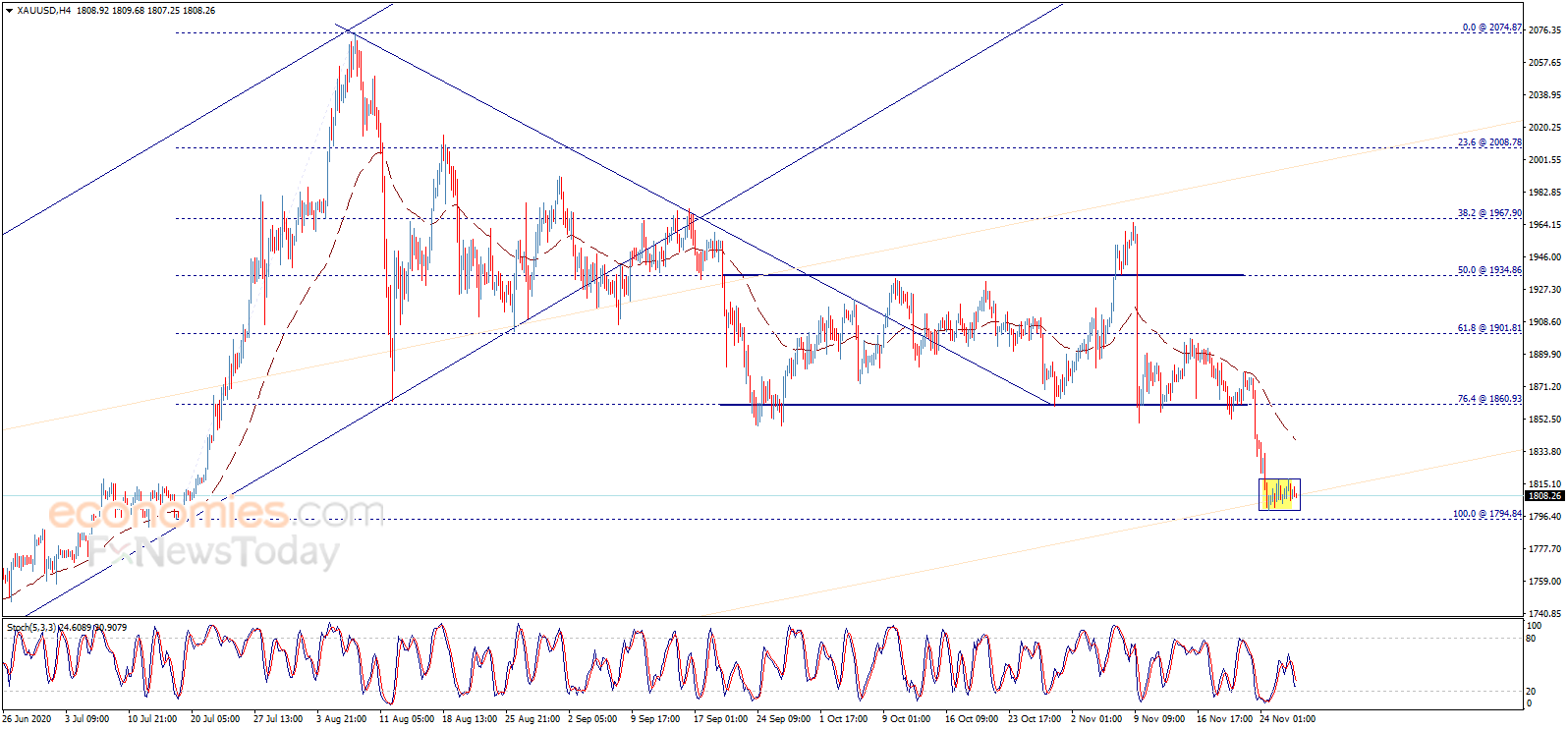 根据Economies.com,假如金价跌破1794.84美元/盎司,后市恐再下跌近30美元。